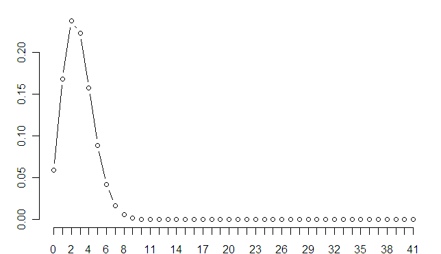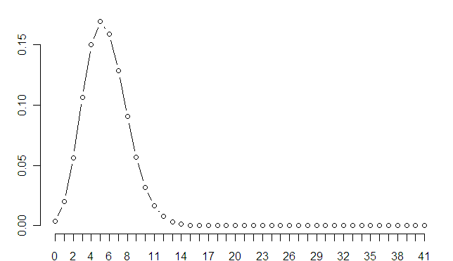 在随机选择,且每次抽取都是等概率的的假定条件下,理论的重复彩票注数的分布(0注至41注)如下: