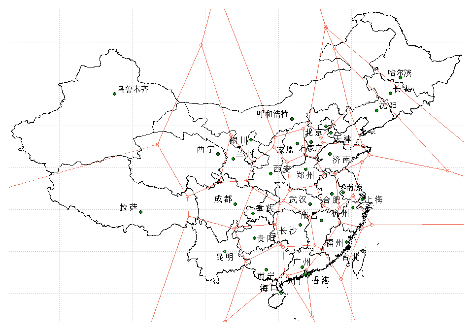 下面,我根据各个省会城市(包括香港、澳门)的地理位置,利用 Voronoi 原理,计算每个省最佳控制范围(使用红色的线条标记):