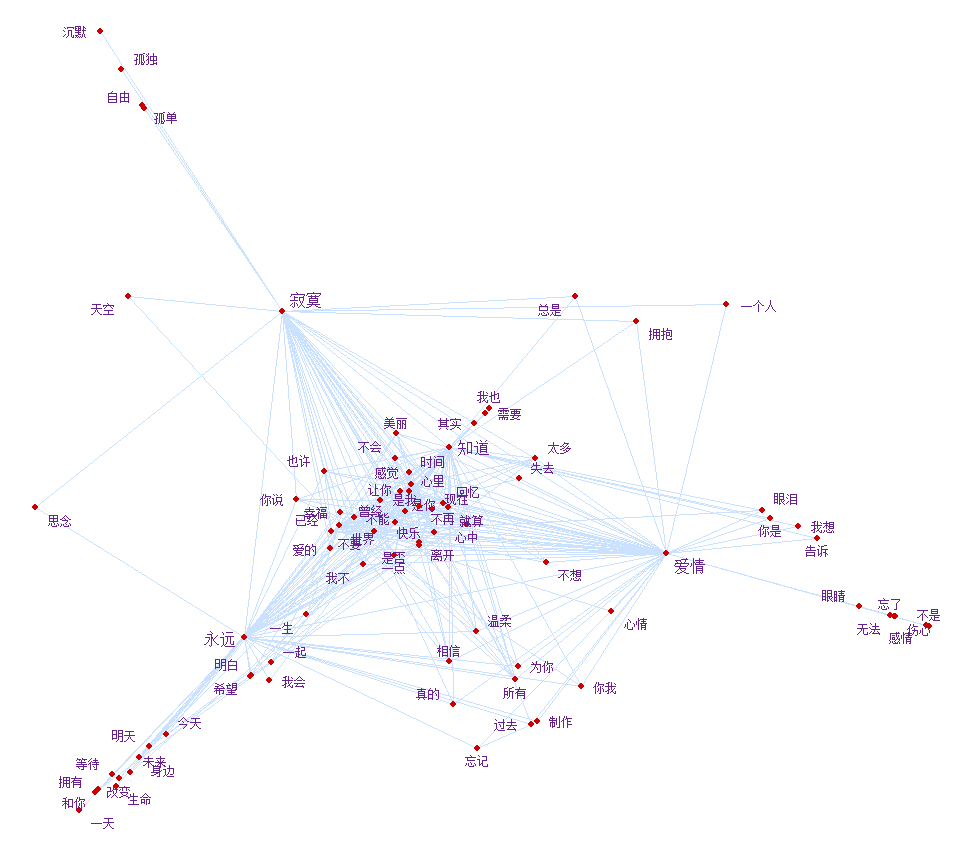 拿到22996 首中文歌曲(844 个流行歌手)之后,总觉得在这些非结构化数据背后肯定隐藏了什么,但到底会有什么模式呢?当经历了分词、构建矩阵、去除停止词、矩阵约减,最终通过模式识别,统计数字之后爱情居然是这样的一个真相: