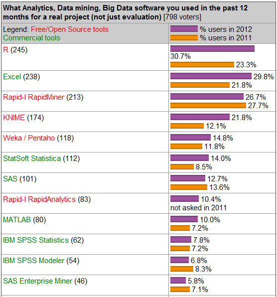 第13期KDnuggets 关于数据挖掘软件的调查结果新鲜出炉,调查了对于过去的 12 个月里实际的项目过程中使用了哪些数据挖掘(分析)软件?不出所料,底层语言使用频率最高的是依旧是 R 语言、SQL、Java和 Python。而从软件工具角度上看,R、Excel和RapidMiner则名列三甲(去年R排名第二),具体排名如下图:
