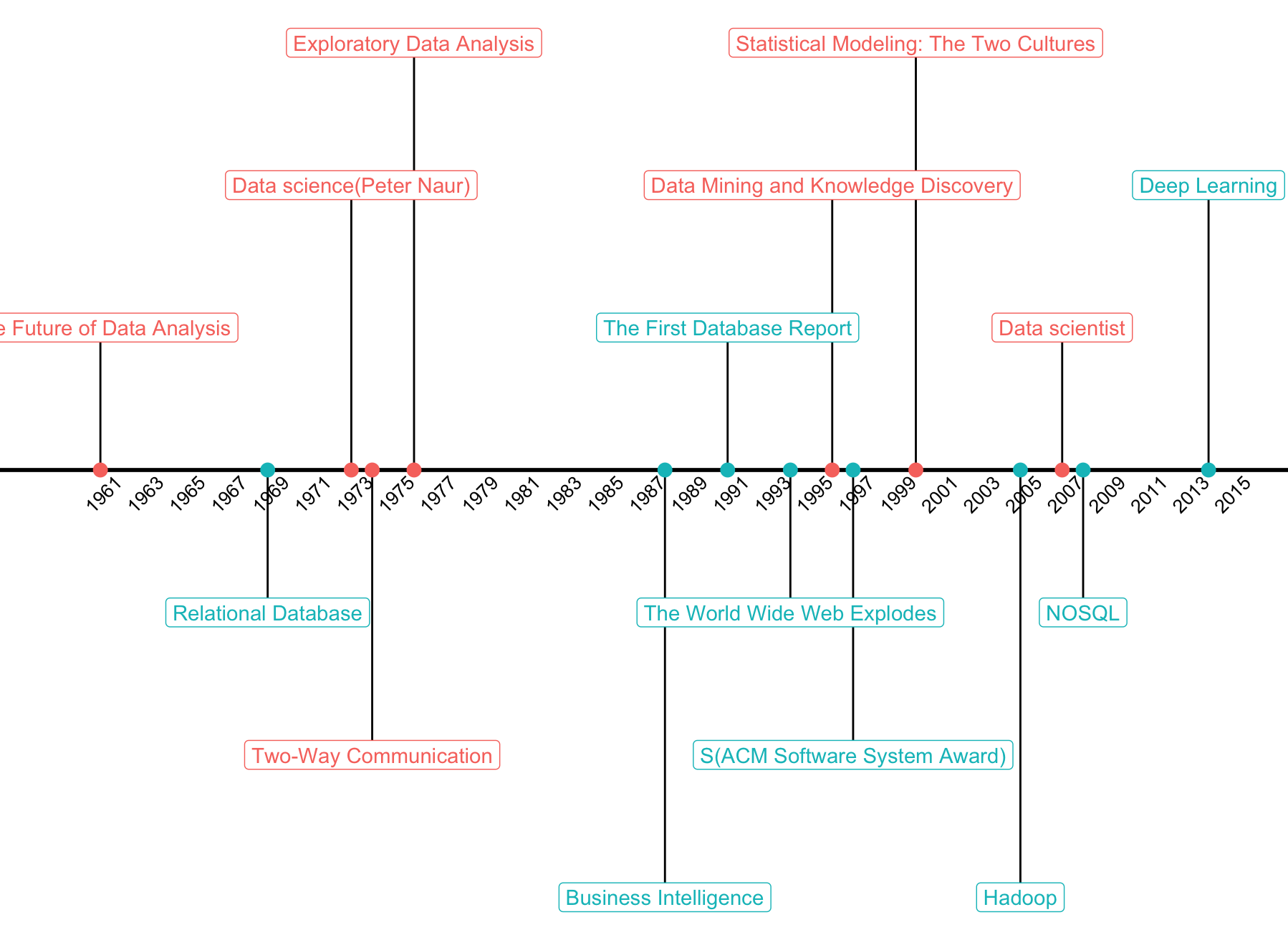 十月份在公司的技术中心分享了《数据思维、技术到商业价值》,从数据科学的重要基石之一统计学开讲,帮大家串了一下数据科学到底是什么东西。其中有一页幻灯片,讲到我心目中数据科学 milestone 的时间轴,这里分享给大家,以及怎么使用 R 包绘制。啥也不说,先看图: