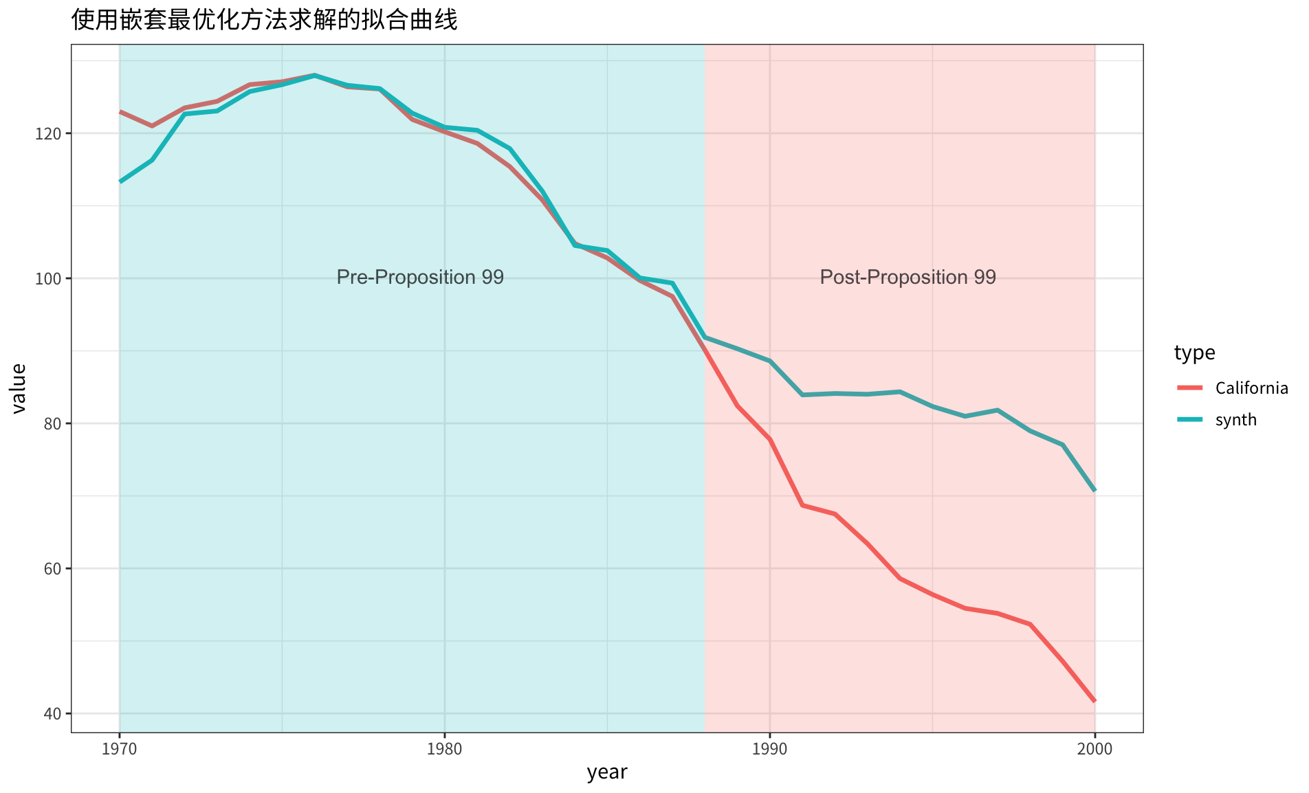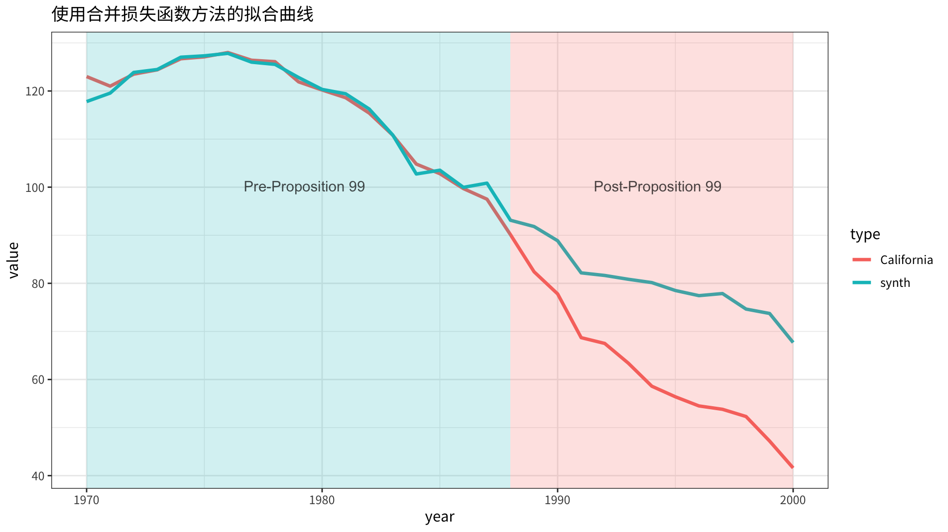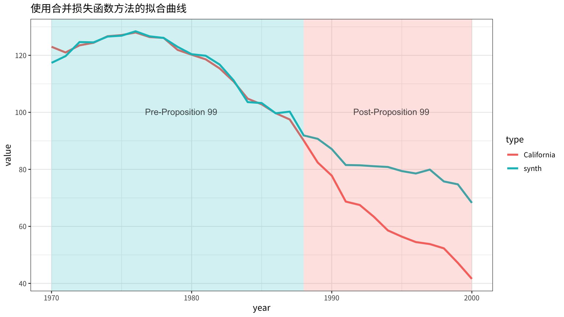 实际和合成控制组有这样的比较效果: